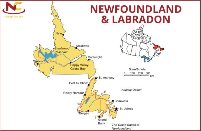 Bang Newfoundland và Labrador: Nằm tọa lạc tại phía Đông Bắc của Bắc Mỹ, canada. Trong đó diện tích mặt nước là 31.340km2, diện tích đất liền chiếm 373.872km2.