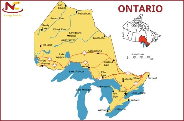 Bang Ontario: Phía đông tiếp giáp với Quebec, phía tây tiếp giáp Manitoba, phía bắc tiếp giáp giữa vịnh Hudson cùng vịnh James cuối cùng là phía nam tiếp giáp Ngũ Đại Hồ và sông St. Lawrence.