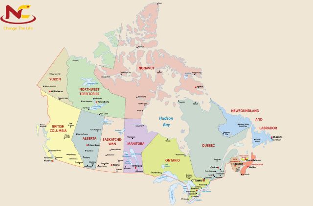 Nhìn vào bản đồ các bang của Canada, bạn có thể dễ dàng nhận biết được thông qua các màu sắc khác nhau. Nhìn vào bản đồ sẽ thấy có 10 màu sắc khác nhau thể hiện sự phân chia thành 10 tỉnh bang riêng biệt của Canada. Cụ thể như sau: