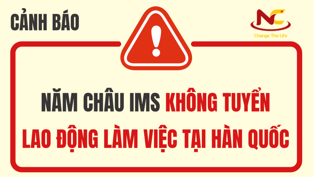 Thời gian gần đây, Năm Châu IMS đã ghi nhận một số trường hợp các đối tượng xấu mạo danh Công ty Năm Châu IMS thông qua Website, Facebook, Zalo, Tiktok.để đăng tin tuyển dụng lao động đi Hàn Quốc với những lời quảng cáo hấp dẫn như: “đi nhanh – chi phí thấp”, “không cần kinh nghiệm”, “bao đỗ visa 100%”… Những thông tin này hoàn toàn sai sự thật và không liên quan đến hoạt động chính thức của công ty.