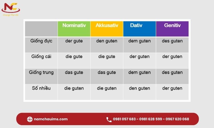 Dưới đây là bảng minh họa về cách chia đuôi của tính từ tiếng Đức dựa trên giới tính và trường hợp của danh từ: