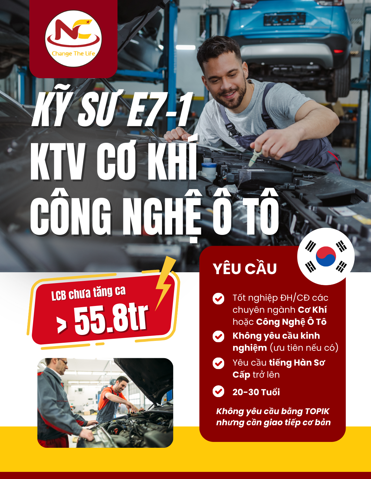 Công ty Năm Châu IMS thông báo tuyển dụng lao động cho đơn hàng E7-1 Hàn Quốc – Kỹ thuật viên Cơ Khí/ Kỹ thuật viên Công Nghệ Ô Tô. Nếu bạn đang quan tâm tới thị trường XKLD Hàn Quốc có thể tham khảo ngay công việc này.