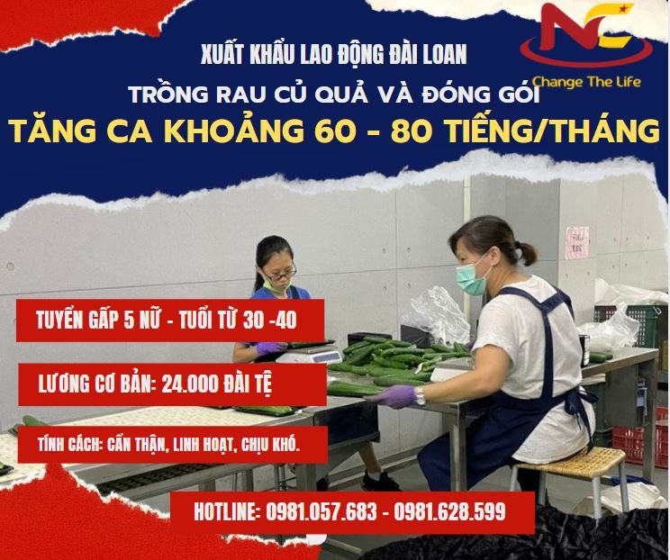 Tuyển gấp 5 lao động nữ đi trồng rau củ quả và đóng gói tại Đài Loan với mức lương cao, thời gian tăng ca làm thêm nhiều. Công việc nhẹ nhàng, đơn giản và không hề phức tạp hay nặng nhọc. Hãy cùng Năm Châu IMS tìm hiểu các thông tin cơ bản ở bên dưới nhé, để được tư vấn thêm từ chuyên viên hàng đầu hiện nay hãy đến với chúng tôi.