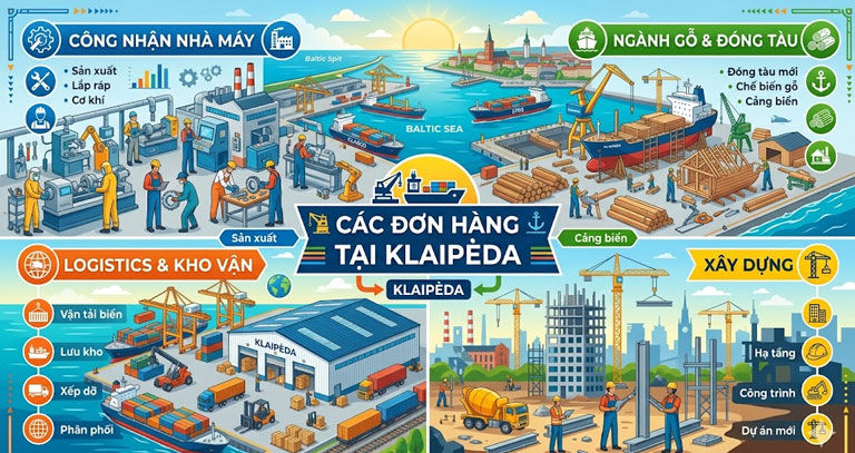 Klaipėda tập trung rất nhiều khu công nghiệp và kho bãi lớn. Dưới đây là những ngành nghề đang tuyển dụng số lượng lớn lao động Việt Nam: