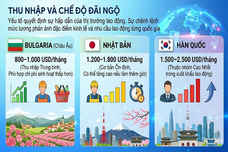 Thu nhập và chế độ đãi ngộ là yếu tố quyết định mức độ hấp dẫn của từng thị trường. Sự chênh lệch về mức lương phản ánh đặc điểm kinh tế và nhu cầu lao động của từng quốc gia.